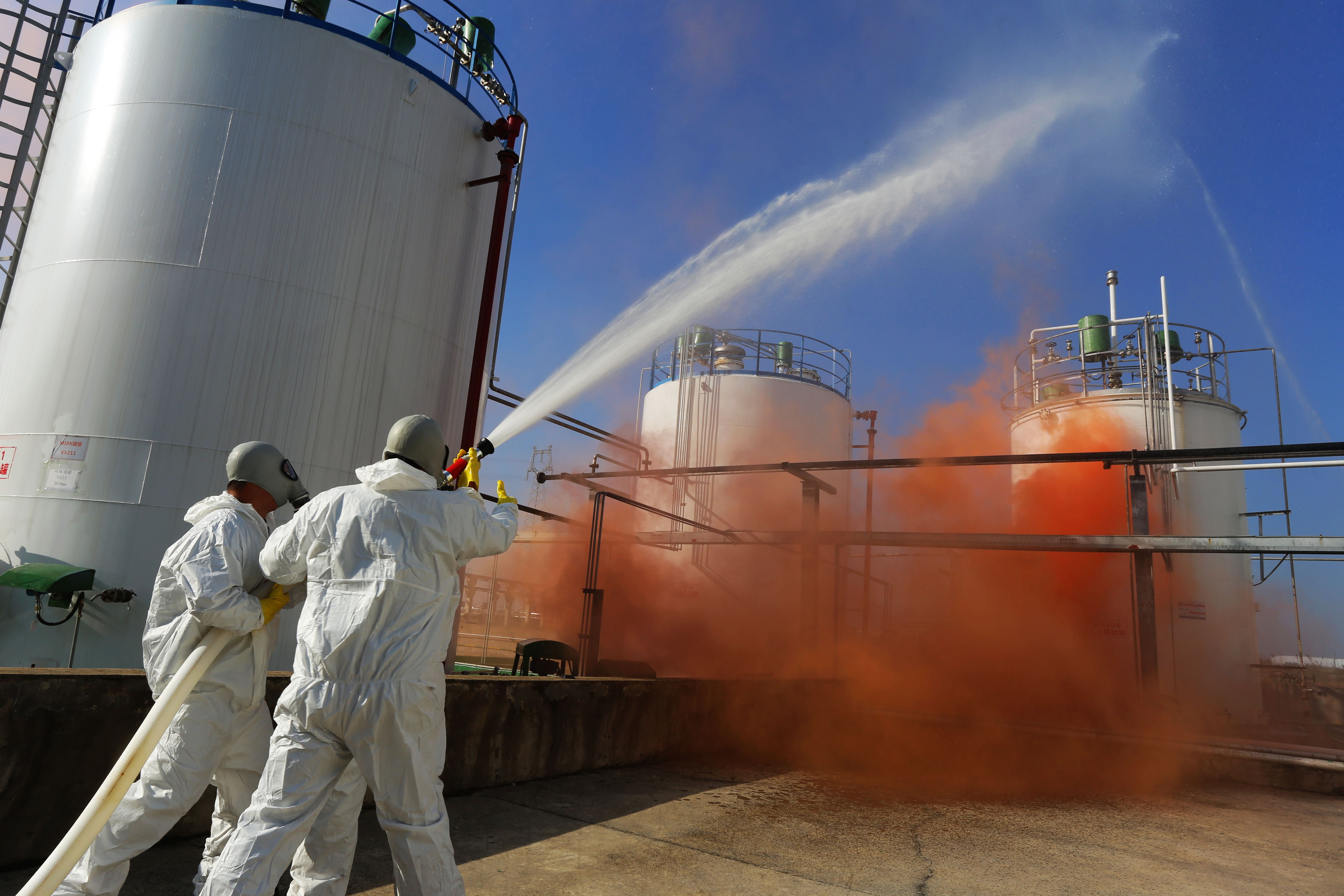 隨著總指揮一聲令下,演練開(kāi)始。此次演練是模擬甲乙類(lèi)罐區(qū)三乙胺儲(chǔ)罐閥門(mén)法蘭墊子壞損,三乙胺大量泄漏事件。調(diào)度員報(bào)警后,立即啟動(dòng)公司級(jí)應(yīng)急預(yù)案,消防分隊(duì)、搶險(xiǎn)搶修分隊(duì)、警戒疏散分隊(duì)、污染控制環(huán)境監(jiān)測(cè)等7個(gè)應(yīng)急救援分隊(duì)奔赴現(xiàn)場(chǎng)。搶險(xiǎn)搶修分隊(duì)穿戴防化服進(jìn)行實(shí)地勘查,堵住事故現(xiàn)場(chǎng)的泄漏點(diǎn),進(jìn)行快速洗消處置。經(jīng)過(guò)40分鐘緊急處置,三乙胺泄漏得到有效控制,此次環(huán)境突發(fā)事件處置演練順利完成。