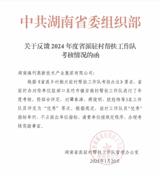近日,從省派駐村幫扶工作隊管理辦公室獲悉,集團駐洞口縣安南村幫扶工作隊2024年度以全優(yōu)佳績?yōu)猷l(xiāng)村振興工作交上滿意答卷:工作隊考核“好”等次,譚春濤、胡俊明、歐經(jīng)緯3名工作隊員考核“優(yōu)秀”等次。