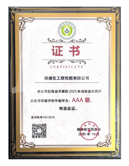 湖南省農(nóng)藥行業(yè)信用等級(jí)評(píng)價(jià)每?jī)赡觊_(kāi)展一次,從經(jīng)營(yíng)狀況、信用記錄、社會(huì)責(zé)任等多維度對(duì)企業(yè)綜合考評(píng),是行業(yè)內(nèi)最具公信力的信用資質(zhì)認(rèn)證之一。此次湖南化工研究院獲評(píng)AAA級(jí),不僅是企業(yè)綜合實(shí)力的體現(xiàn),更彰顯了其在推動(dòng)湖南農(nóng)藥產(chǎn)業(yè)高質(zhì)量發(fā)展中的帶動(dòng)作用。
