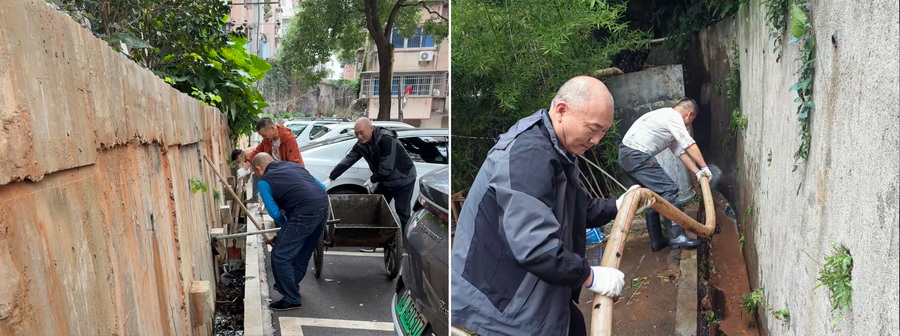 活動當(dāng)天,黨員干部帶頭沖鋒,群眾代表積極響應(yīng),12名參與人員以兩人為一組,分成六個工作小組,對院內(nèi)45處下水井及三條主要排水溝展開“拉網(wǎng)式”徹底清理。在清淤現(xiàn)場,大家各司其職、默契配合:有的俯身探入井口,用鐵鍬小心翼翼鏟除沉積的淤泥;有的手持掃把清理溝邊雜草,防止落葉再次堵塞管道;有的操控高壓水槍沖洗井壁污垢,確保排水通道內(nèi)壁潔凈;清運(yùn)組則及時將清理出的淤泥、枯枝葉及各類沖積雜物分批轉(zhuǎn)運(yùn)至指定垃圾站,避免二次污染。盡管井下淤泥散發(fā)著刺鼻異味,操作過程中難免被污水和淤泥濺滿身,但全體人員始終熱情高漲,無人叫苦、無人退縮,用沾滿泥污的雙手守護(hù)著大院的排水“生命線”。