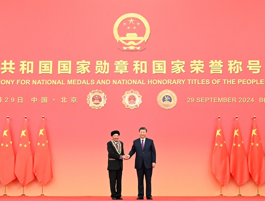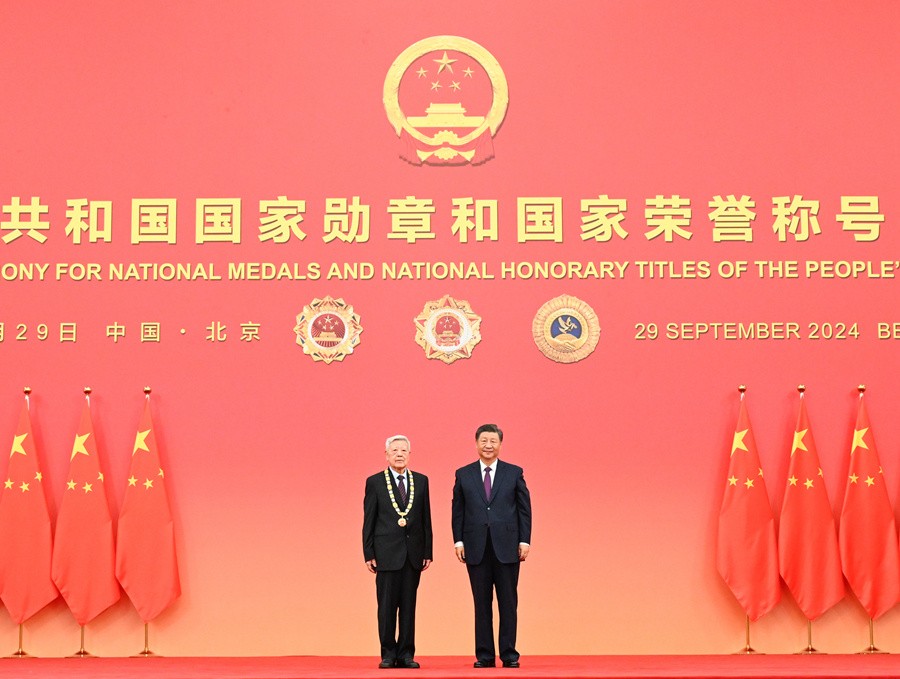 9月29日,中華人民共和國國家勛章和國家榮譽稱號頒授儀式在北京人民大會堂金色大廳隆重舉行。中共中央總書記、國家主席、中央軍委主席習近平向“共和國勛章”獲得者黃宗德頒授勛章。新華社記者謝環(huán)馳攝