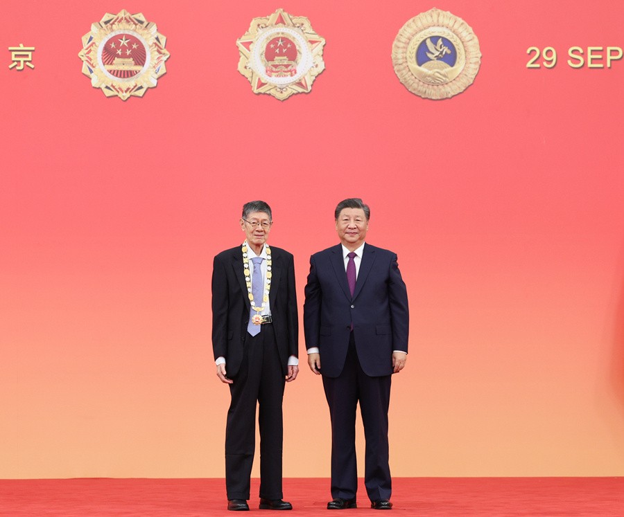 9月29日,中華人民共和國國家勛章和國家榮譽稱號頒授儀式在北京人民大會堂金色大廳隆重舉行。中共中央總書記、國家主席、中央軍委主席習近平向“人民科學家”國家榮譽稱號獲得者趙忠賢頒授獎章。新華社記者鞠鵬攝
