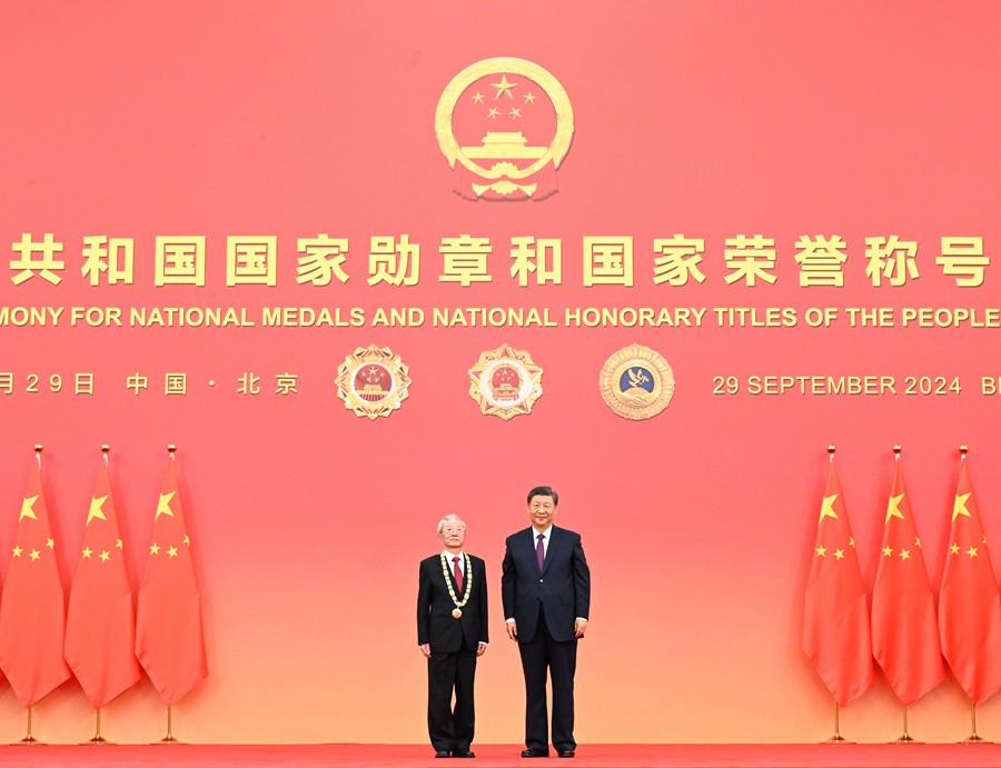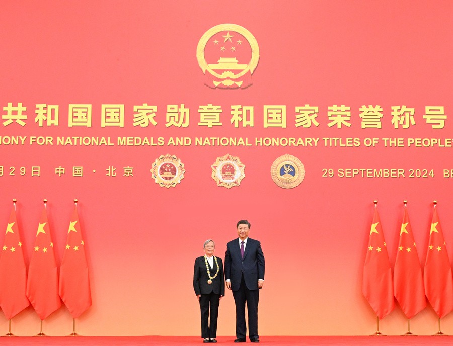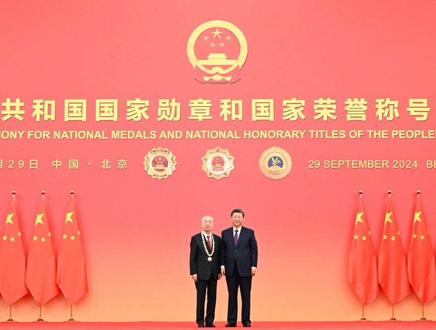 9月29日,中華人民共和國國家勛章和國家榮譽稱號頒授儀式在北京人民大會堂金色大廳隆重舉行。中共中央總書記、國家主席、中央軍委主席習近平向“人民科學家”國家榮譽稱號獲得者趙忠賢頒授獎章。新華社記者謝環(huán)馳攝