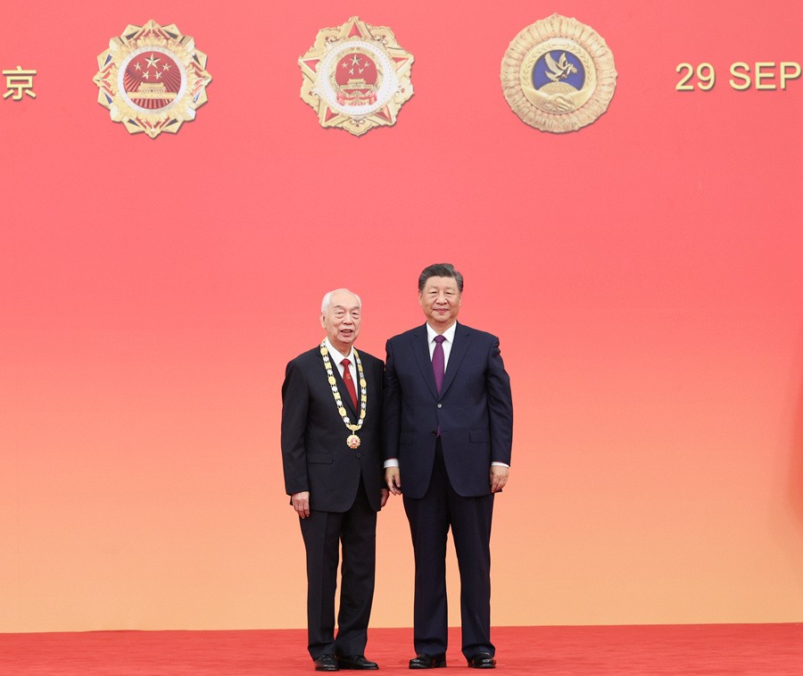 9月29日,中華人民共和國國家勛章和國家榮譽稱號頒授儀式在北京人民大會堂金色大廳隆重舉行。中共中央總書記、國家主席、中央軍委主席習近平向“共和國勛章”獲得者黃宗德頒授勛章。新華社記者鞠鵬攝