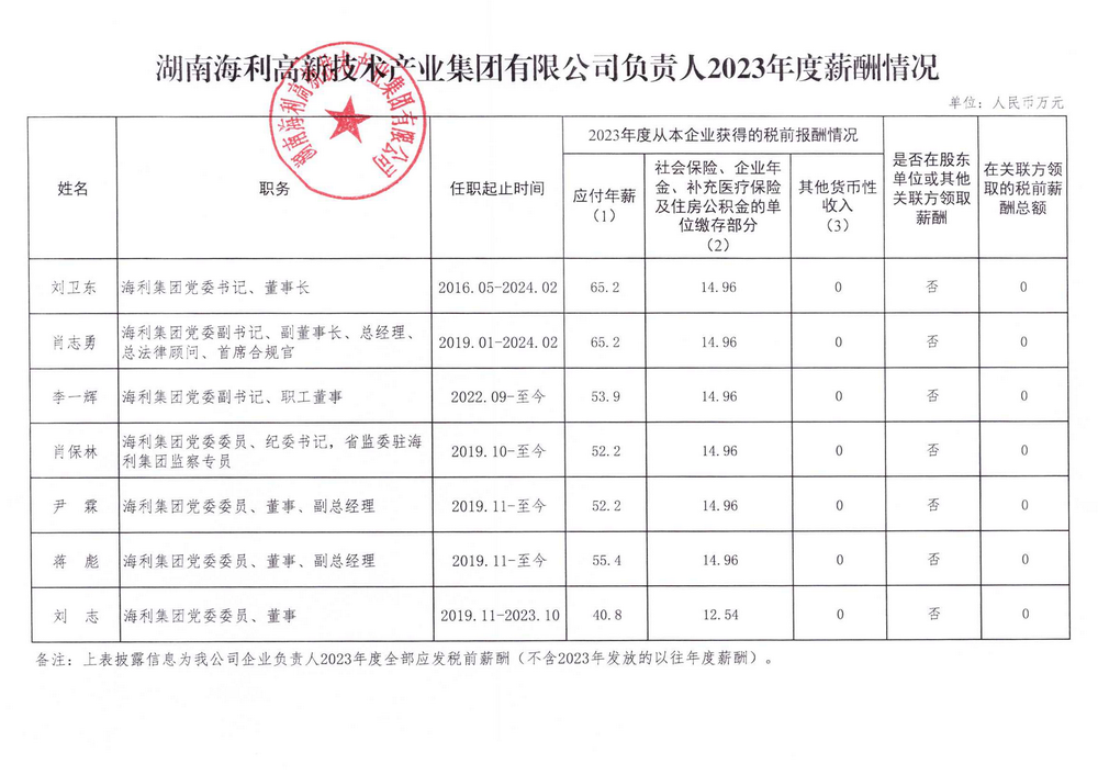 湖南海利高新技術(shù)產(chǎn)業(yè)集團(tuán)有限公司負(fù)責(zé)人2023年度薪酬情況