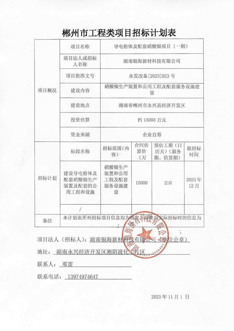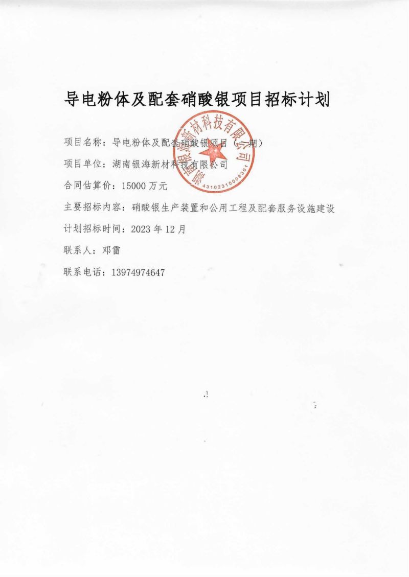 導電粉體及配套硝酸銀項目(一期)招標預公告